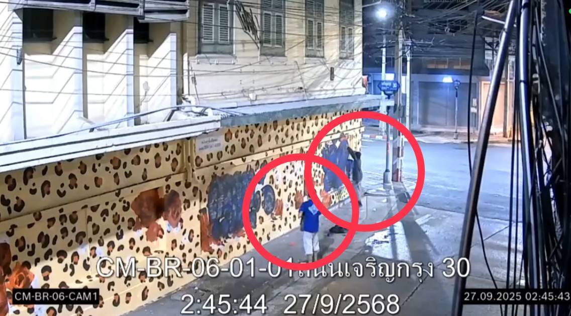 กล้องวงจรปิดของกรุงเทพมหานครสามารถบันทึกภาพนาทีที่ชาย 3 คน เข้าก่อเหตุใช้สีสเปรย์พ่นทับภาพ…