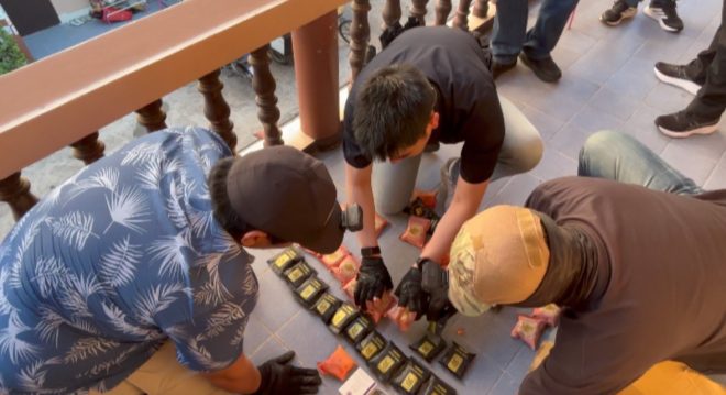 น้ำหนักรวมพร้อมซองประมาณ 6,500 กรัม นอกจากนี้ยังยึดกล่องกระดาษขนาดกว้าง 23 ซม. ยาว 29 ซม. สูง 16 ซม. จำนวน 1 ใบ ซึ่งใช้บรรจุยาเสพติดดังกล่าว