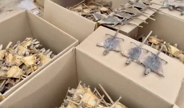 1. ซากตุ๊กแกแห้ง บรรจุอยู่ในกล่องกระดาษ กล่องละประมาณ 300 ตัว หนักประมาณ 10 กก. จำนวน 414 กล่อง รวมหนักประมาณ 4,140 กก. จำนวนซากตุ๊กแกทั้งหมดประมาณ 124,200 ตัว