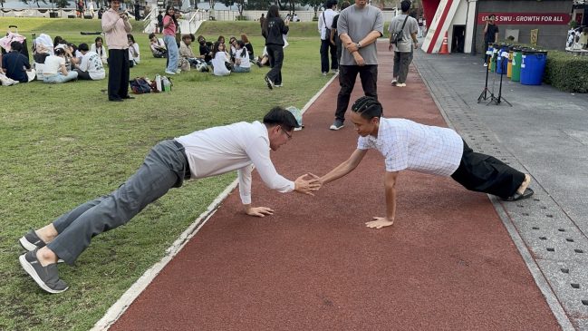 เมื่อเวลา 15.30 น. วันที่ 13 มีนาคม ที่มหาวิทยาลัยศรีนครินทรวิโรฒ (มศว) ประสานมิตร มงคลกิตติ์ สุขสินธารานนท์ หรือ “เต้ 007” เดินทางมาพบปะนักศึกษา พร้อมร่วมถ่ายรูปเซลฟี่และทำคอนเทนต์กับน้อง ๆ รวมถึงชวนแข่งวิดพื้น สร้างบรรยากาศคึกคักภายในมหาวิทยาลัย
