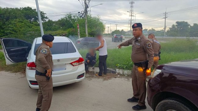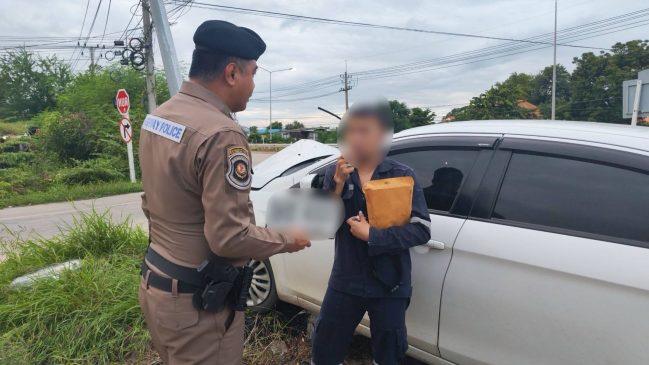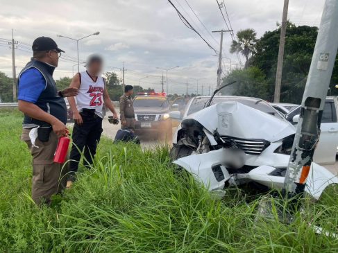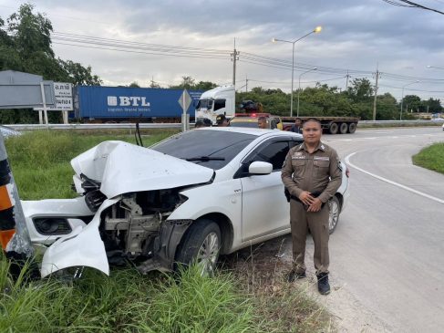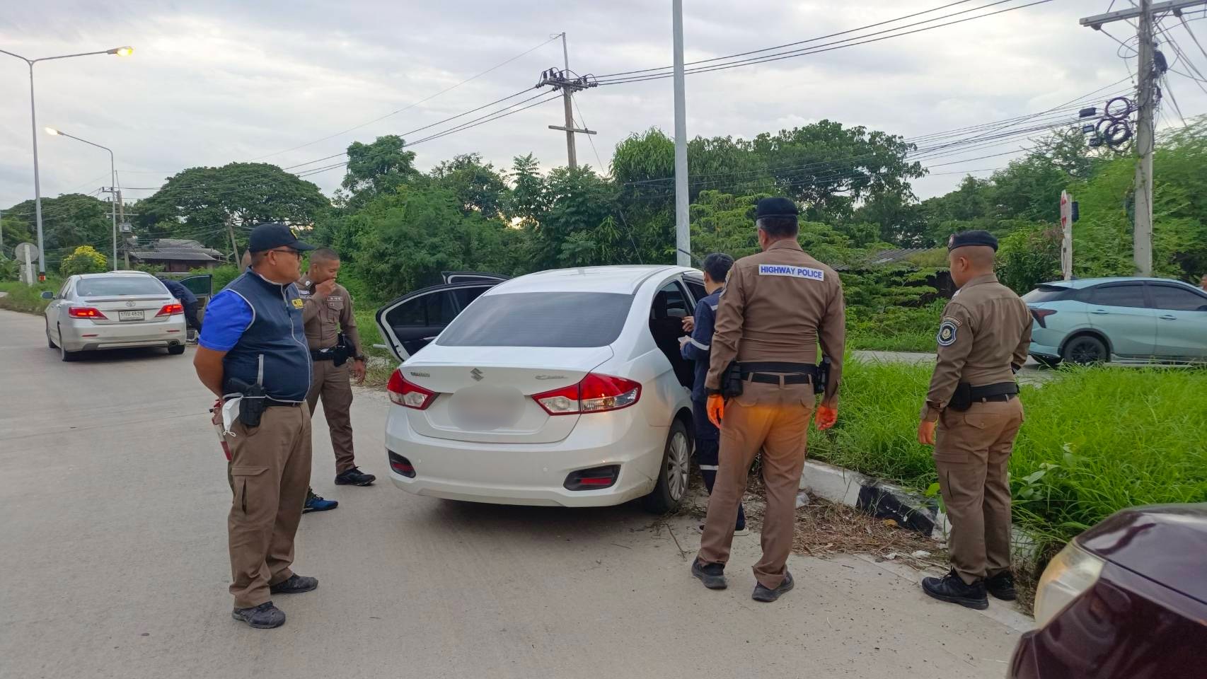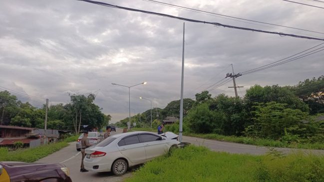 CIB ล่าระทึก! เก๋งสวมทะเบียนปลอมซิ่งหนีตำรวจทางหลวง ก่อนพุ่งชนเสาไฟฟ้าพังยับ
