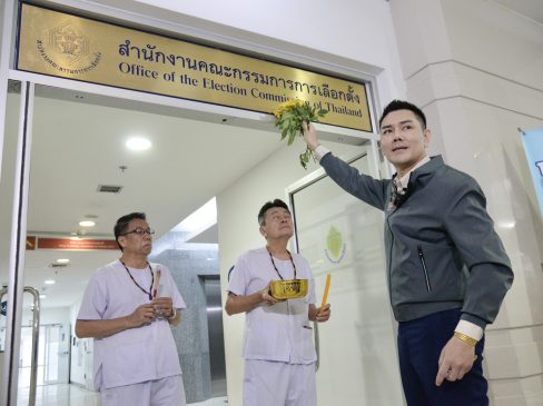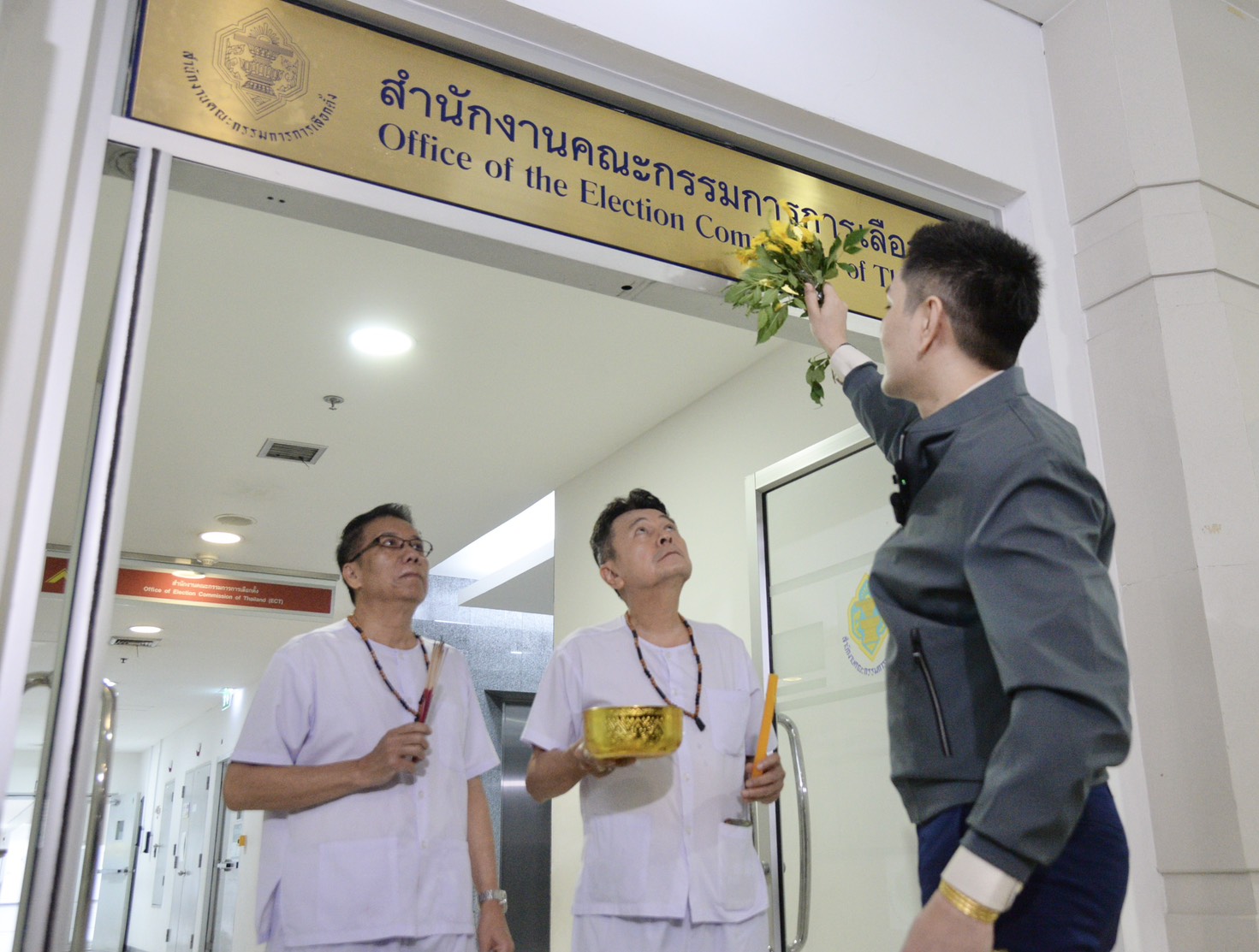 กกต. วันนี้ ( 18 มี.ค.) นายภัทรพงศ์ ศุภักษร หรือทนายอั๋น บุรีรัมย์ นำกลุ่มบุคคล แต่งชุดพราหมณ์มาพรหมน้ำมนต์ ที่หน้าสำนักงาน กกต. เพื่อขับไล่มนต์ดำเขมรออกจากสำนักงาน กกต. เพื่อให้ กกต.ทำหน้าที่ในคดีฮั้วเลือก สว.อย่างตรงไปตรงมา