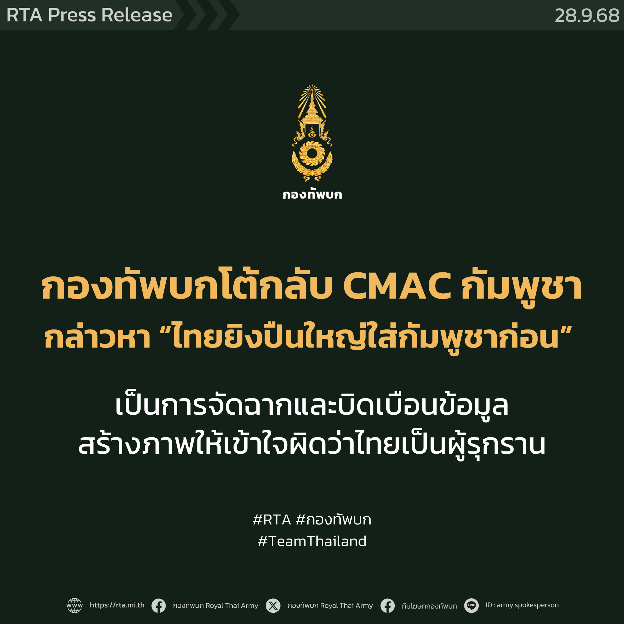 พลตรี วินธัย สุวารี โฆษกกองทัพบก ได้ออกมาชี้แจงว่า การกล่าวอ้างของ ผอ. CMAC เป็นหนึ่งในประเด็นโฆษณาชวนเชื่อ ที่ฝ่ายกัมพูชาได้มีการวางแผนการจัดฉากอย่างเป็นระบบ โดยเหตุการณ์ที่เกิดขึ้นในวันที่ 27 ก.ย. 68 ที่ผ่านมา ชัดเจนว่าเป็นฝ่ายกัมพูชาที่วางแผนยิงเข้ามายังฝั่งไทย พยายามยั่วยุให้ไทยตอบโต้ พร้อมออกแถลงการณ์บิดเบือนในทุกช่องทาง