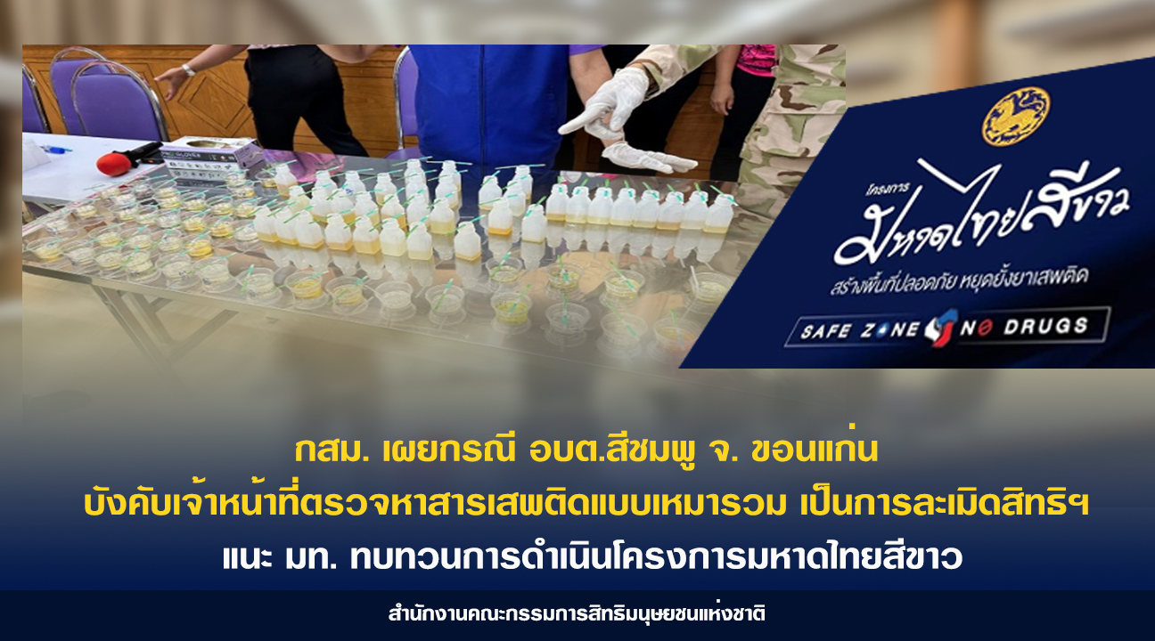 กสม.  เผยกรณี อบต.สีชมพู จ. ขอนแก่น บังคับเจ้าหน้าที่ตรวจหาสารเสพติดแบบเหมารวม เป็นการละเมิดสิทธิฯ แนะ มท. ทบทวนการดำเนินโครงการมหาดไทยสีขาว