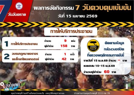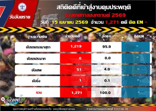ขณะที่ยอดคดีสะสมตลอด 6 วัน (10 – 15 เมษายน 2569) จำนวนทั้งสิ้น 5,232 คดี แบ่งเป็น คดีขับรถขณะเมาสุรา จำนวน 4,945 คดี คิดเป็นร้อยละ 94.51 คดีขับรถประมาท จำนวน 4 คดี คิดเป็นร้อยละ 0.08 คดีขับเสพ จำนวน 281 คดี คิดเป็นร้อยละ 5.37 และคดีขับซิ่ง จำนวน 2 คดี คิดเป็นร้อยละ 0.04