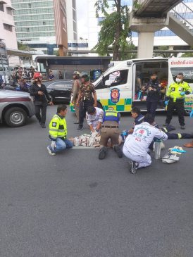 ที่เกิดเหตุใกล้แยกพญาไท พบชายชาวต่างชาติไม่ทราบชื่อ สัญชาติ อายุประมาณ55-60 ปี คลุ้มคลั่งไม่ใส่เสื้อ นุ่งกางเกงช้างขายาวน้ำตาล ขาว ถุงเท้าสีดำ ยืนอยู่ด้านนอกสะพานลอย ความสูงประมาณ 5 -6 เมตร อยู่ระหว่างเกลี้ยกล่อม ต่อมาเวลา 15.43 น. ขณะเจ้าหน้าที่กำลังกางเบาะลมชายดังกล่าวได้ทิ้งตัวลงศีรษะกระแทกพื้นถนนศรีอยุธยา ขาออกได้รับบาดเจ็บที่ศีรษะ หมดสติอาการสาหัส ในตัวไม่พบหลักฐานว่าเป็นผู้ใด อาสาสมัครมูลนิธิอยู่ระหว่างปฐมพยาบาลทำซีพีอาร์(ปั้มหัวใจ) ก่อนนำส่งรพ.พญาไท1 ผ่าตัดช่วยเหลือเป็นการด่วน