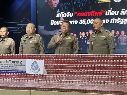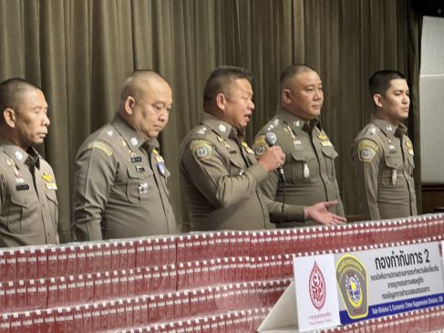 เมื่อเวลา 13.30 น. วันที่ 22 เม.ย. ที่อาคารประชาอารักษ์ กองบังคับการปราบปราม (บก.ป.) พล.ต.ท.ไตรรงค์ ผิวพรรณ รองจเรตำรวจแห่งชาติ และในฐานะโฆษกสำนักงานตำรวจแห่งชาติ พร้อมด้วย พล.ต.ท.ณัฐศักดิ์ เชาวนาศัย ผบช.ก., พล.ต.ต.จรูญเกียรติ ปานแก้ว รอง ผบช.ก., พ.ต.อ.ปทักข์ ขวัญนา รอง ผบก.ป. และ ว่าที่ พ.ต.อ.เจตนิพัทธ์ ศิริวัฒน์ ผกก.1 บก.ป. ร่วมกันแถลงผลการจับกุมขบวนการเรียกรับผลประโยชน์จำนวน 2.5 ล้านบาท ภายในห้องกัก ตม.สวนพลู