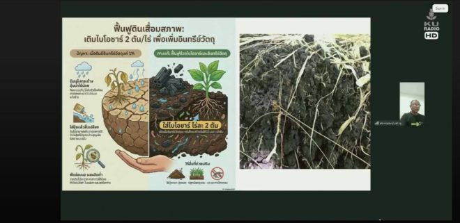“ไบโอชาร์ไม่ใช่ปุ๋ย แต่ใส่เพื่อบำรุงดินโดยใช้ร่วมกับปุ๋ยเคมีให้เหมาะกับการปลูกพืชมากขึ้น และลดการใช้ปุ๋ยส่วนเกินลงเพื่อประหยัดต้นทุน เพราะไบโอชาร์จะช่วยเพิ่มความชื้นในดิน ทำให้ดินมีรูพรุนเยอะช่วยส่งเสริมการเจริญของเชื้อราไมคอไรซาและจุลินทรีย์ที่ตรึงไนโตรเจนป้องกันการชะล้างปู๋ยและธาตุอาหารในดิน” อาจารย์ผู้เชี่ยวชาญด้านดินและปุ๋ยระบุ
