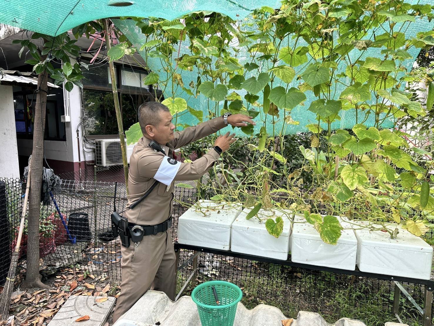 ร.ต.อ.รัตนชัย สลับศรี รองสวป.สน.บางเขน ช่วยงาน จราจร. ผู้ดูแลแปลงผัก ระบุว่า ทางงานจราจร สน.บางเขนได้ร่วมกับสน.บางเขน ดำเนินการปลูกพืชผักสวนครัว เลี้ยงกบ เลี้ยงไก่และหอย บริเวณศูนย์ควบคุมจราจร วงเวียนบางเขน ถนนพหลโยธิน ซึ่งมีการดัดแปลงปรับปรุงพื้นที่ว่างเปล่าบริเวณด้านหลังป้อมจราจรให้เป็นสถานที่ใช้ปลูกผักและเลี้ยงกบ ซึ่งเลี้ยงมานานกว่า 2 เดือนแล้ว วันนี้จึงได้ตัดเก็บผักชี และแตงกวา นำมาปรุงอาหารในสายงานจราจร บางส่วนก็แบ่งให้กับฝ่ายอื่นๆ ส่วนรากผักชีก็นำไปเพาะปลูกให้แตกยอดขึ้นใหม่อีกครั้ง