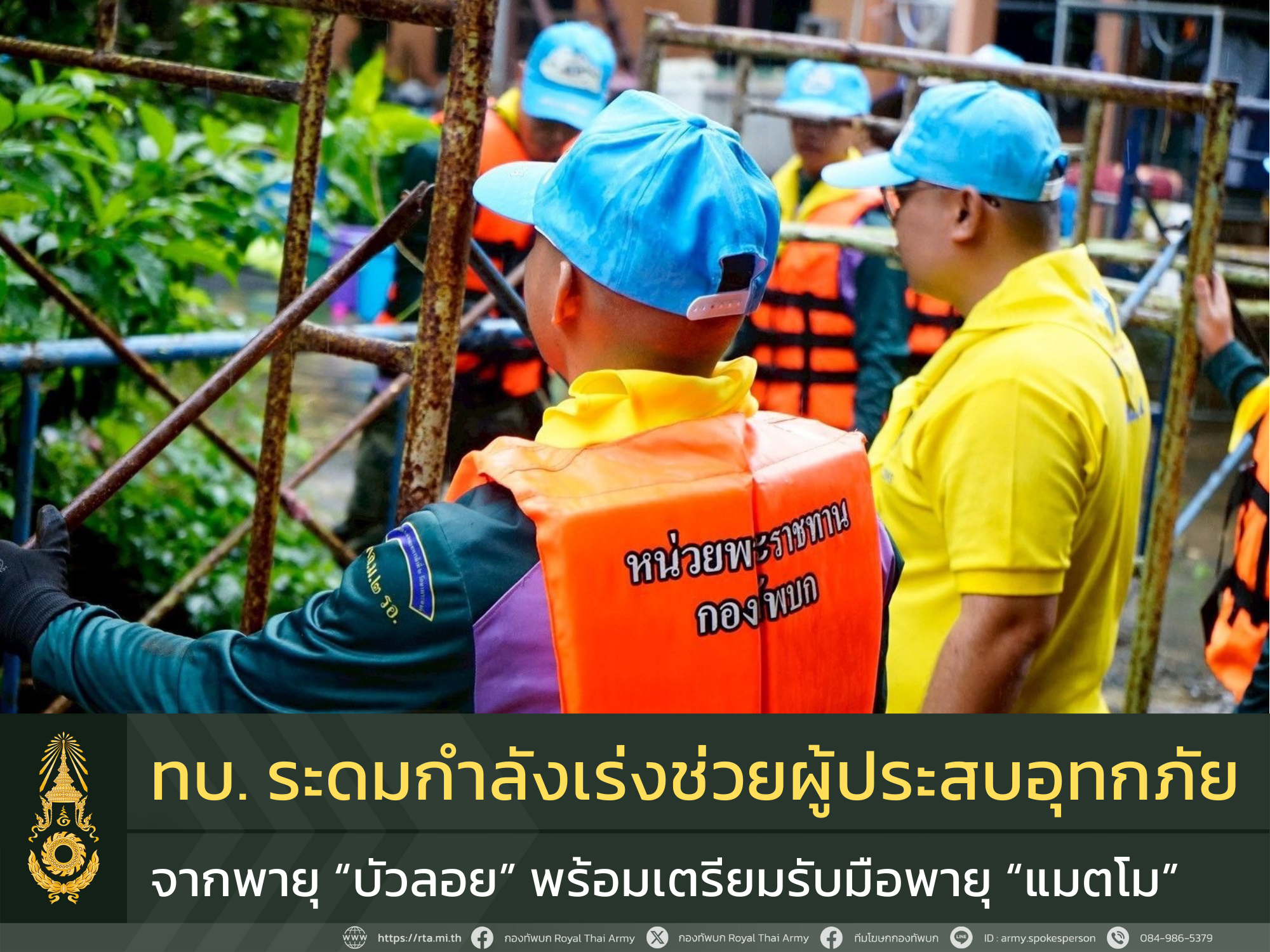 กองทัพบก / ศูนย์บรรเทาสาธารณภัยกองทัพบก ยืนยันความพร้อมของหน่วยทหารในทุกภูมิภาค เร่งดำเนินการช่วยเหลือประชาชนที่ได้รับผลกระทบจากอิทธิพลของพายุอย่างรอบด้าน โดยบูรณาการความร่วมมือกับทุกภาคส่วน เพื่อให้การฟื้นฟูและการกลับคืนสู่ชีวิตปกติของประชาชนเป็นไปโดยเร็วและยั่งยืน