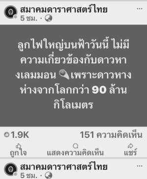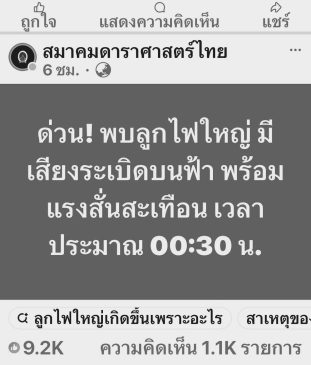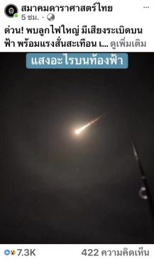 รายงานการพบเห็นและแรงสั่นสะเทือน เฟซบุ๊กเพจ “สมาคมดาราศาสตร์ไทย” ได้ออกมาแจ้งข้อมูลด่วนว่า “พบลูกไฟใหญ่ มีเสียงระเบิดบนฟ้า พร้อมแรงสั่นสะเทือน เวลาประมาณ 00.30 น.