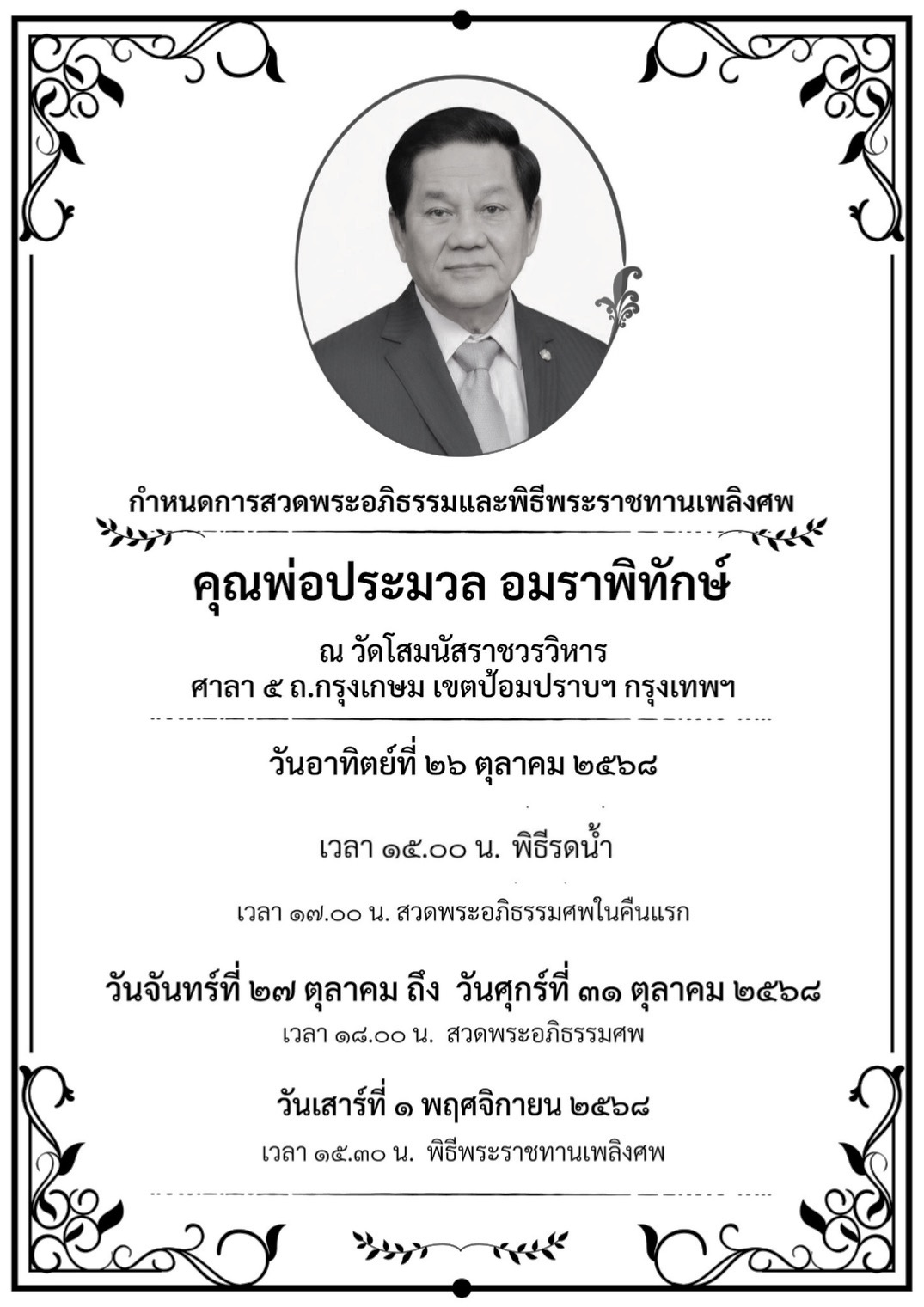 ด้วย คุณพ่อประมวล อมราพิทักษ์ บิดาของ พ.ต.อ.พันษา อมราพิทักษ์ ผกก.สน.ยานนาวา ได้ถึงแก่กรรม เมื่อวันที่ 25 ต.ค.68 ซึ่งมีกำหนดจัดพิธีบำเพ็ญกุศล ณ วัดโสมนัสราชาชวรวิหาร ศาลา 5