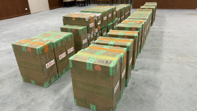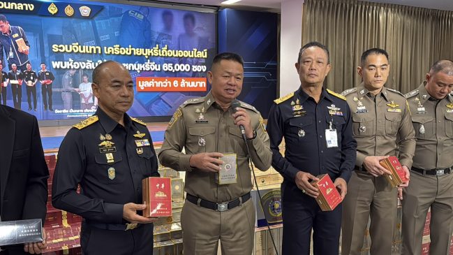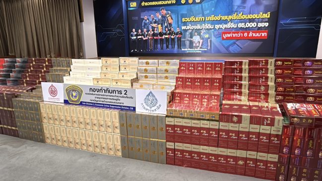 และกล่องพัสดุ สำหรับจำหน่ายให้ลูกค้า เมื่อถูกสอบถามนายฟาง เหว่ยซิน รับว่าตนเป็นแอดมินลักลอบจำหน่ายบุหรี่จีนเถื่อนให้แก่บุคคลโดยทั่วไปผ่านช่องทางออนไลน์ Telegram และ Tiktok จากนั้นได้นำไปตรวจค้นอาคารพาณิชย์จุดที่ ๒ พบเป็นอาคารพาณิชย์ถูกปิดร้าง แต่ภายในเป็นสถานที่สำหรับเก็บซุกซ่อนบุหรี่ จากการตรวจค้นพบ บุหรี่จีนเถื่อน จำนวน ๙๐ ลัง (๔๕,๐๐๐ ซอง) เจ้าหน้าที่ตำรวจฯจึงได้แจ้งสิทธิ