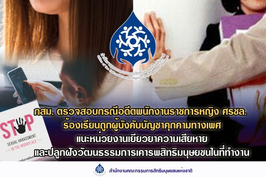 3. กสม. ตรวจสอบกรณีอดีตพนักงานราชการหญิง ศรชล. ร้องเรียนถูกผู้บังคับบัญชาคุกคามทางเพศ แนะหน่วยงานเยียวยาความเสียหายและปลูกฝังวัฒนธรรมการเคารพสิทธิมนุษยชนในที่ทำงาน