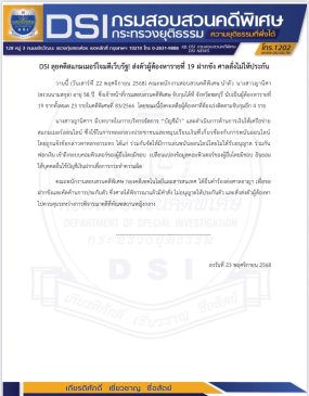 เมื่อวันที่ 22 พ.ย.68 คณะพนักงานสอบสวนคดีพิเศษ กรมสอบสวนคดีพิเศษ (DSI) ได้นำตัว นางสาวญานิศา (สงวนนามสกุล) อายุ 58 ปี ซึ่งถูกจับกุมได้ที่จังหวัดชลบุรี มายื่นคำร้องต่อศาลอาญาเพื่อขอฝากขังและคัดค้านการประกันตัว