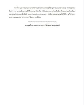 หากพี่น้องประชาชนพบเห็นเพจหรือบัญชีสื่อสังคมออนไลน์ที่มีพฤติกรรมโพสต์ข่าวปลอม หรือหลอกลวงรับบริจาค สามารถแจ้งเบาะแสได้ที่สายด่วน 191 หรือ 1599 และหากตกเป็นเหยื่อมิจฉาชีพหลอกโอนเงินบริจาค สามารถแจ้งความออนไลน์ได้ที่ www.thaipoliceonline.go.th หรือติดต่อสายด่วนศูนย์ปฏิบัติการแก้ไขปัญหาอาชญากรรมออนไลน์ (AOC) 1441 ได้ตลอด 24 ชั่วโมง