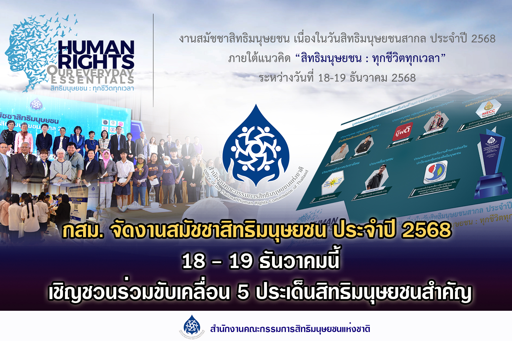 2. กสม. กำหนดจัดงานสมัชชาสิทธิมนุษยชน ประจำปี 2568 ภายใต้แนวคิด “สิทธิมนุษยชน: ทุกชีวิตทุกเวลา” 18 – 19 ธันวาคมนี้ เชิญชวนร่วมขับเคลื่อน 5 ประเด็นสิทธิมนุษยชนสำคัญ