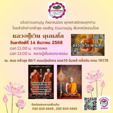 วันที่ 14 ธันวาคม 2568 เวลา 10.00 น เป็นต้นไป ณ. สำนักข่าวกล้าลุย 86/1 ถนนทุ่งมังกร ซอย 10 แขวงฉิมพลี เขตตลิ่งชัน กรุงเทพมหานคร 10170 หลวงปู่เวิน คุเณสโก วัดบูรพาโคกเครือ “พระครูโสภณวินัยวัฒน์” รองเจ้าคณะจังหวัดกาฬสินธุ์ รับกิจนิมนต์มาเทศนาธรรม โดยมี นายวิชัย วงศ์สินสังวร ประธานกรรมการข่าวกล้าลุย ได้นิมนต์หลวงปู่เวิน คุเณสโก วัดบูรพาโคกเครือ มาเทศนาให้แก่ลูกศิษย์และพุทธศาสนิกชนฟังและร่วมทำบุญเพื่อสืบทอดพระพุทธศาสนา