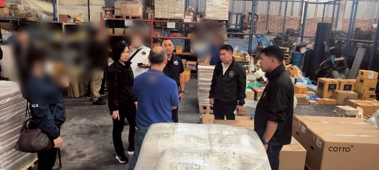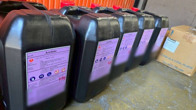จากการเข้าตรวจค้นภายในโรงงานวันนี้ เจ้าหน้าที่พบสารเคมีและเคมีภัณฑ์ รวมปริมาณ 1,245 กิโลกรัม ประกอบด้วย คลอรีนน้ำ จำนวน 21 ถัง (420 กิโลกรัม), อะซีโตน จำนวน 10 ถัง (150 กิโลกรัม) บอแร็กซ์ จำนวน 27 กระสอบ (675 กิโลกรัม) ซึ่งสารเคมีดังกล่าว จัดเป็นวัตถุอันตรายชนิดที่ 1 และ 3 เป็นสารเคมีจำเป็นในขั้นตอนการฟอก และตกผลึกยาเสพติด (ยาบ้า/ไอซ์/เฮโรอีน) ซึ่งอยู่ภายใต้การ ควบคุมของกรมโรงงานอุตสาหกรรม จากการตรวจสอบไม่พบการขึ้นทะเบียนเป็นวัตถุอันตรายและไม่มีใบอนุญาตครอบครอง