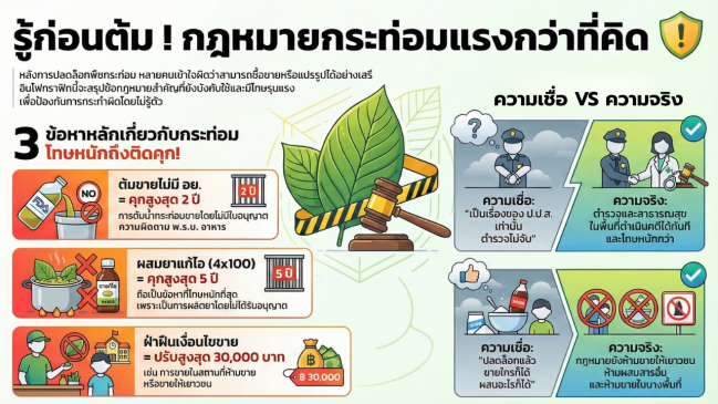 ทั้งนี้ ขอสร้างความเข้าใจที่ถูกต้องว่า การบังคับใช้กฎหมายกับร้านค้าที่ “ต้ม-ผสม-ขาย” น้ำกระท่อม เป็นอำนาจหน้าที่ของ เจ้าหน้าที่ตำรวจ และ เจ้าหน้าที่สาธารณสุข ในพื้นที่ ซึ่งสามารถเข้าจับกุมและดำเนินคดีได้ทันที โดยมีบทลงโทษที่รุนแรงถึงขั้นจำคุก ได้แก่ ความผิดตาม พ.ร.บ.ยา มีโทษจำคุกไม่เกิน 5 ปี และปรับไม่เกิน 10,000 บาท ส่วนความผิดตาม พ.ร.บ.อาหาร มีโทษจำคุกตั้งแต่ 6 เดือนถึง 2 ปี และปรับตั้งแต่ 5,000 ถึง 20,000 บาท
