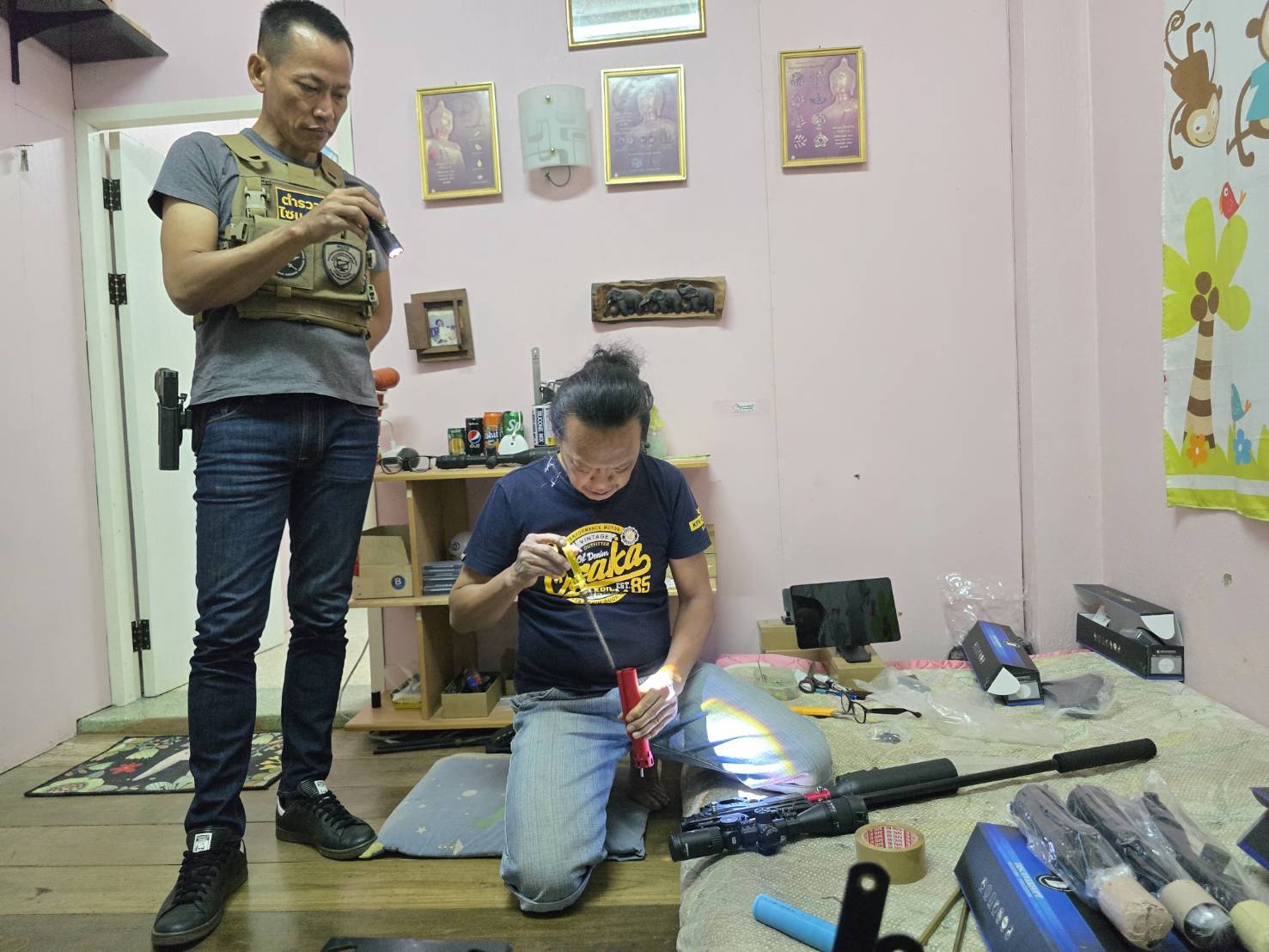 โดยเจ้าหน้าที่ตำรวจ กก.2 บก.สอท.4 ได้ตรวจสอบพบการลักลอบจำหน่ายอาวุธปืนอัดลมแรงดันสูงโดยไม่ได้รับอนุญาต โดยโฆษณาผ่านช่องทาง YouTube ชื่อ “ลองแลคร๊าฟ” แล้วให้ลูกค้าที่สนใจติดต่อผ่านทแอปพลิเคชันไลน์ เจ้าหน้าที่ตำรวจจึงได้รวบรวมพยานหลักฐานขออำนาจศาลออกหมายค้นเป้าหมายได้สำเร็จ