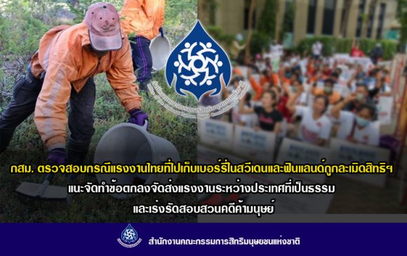 1. กสม. ตรวจสอบกรณีแรงงานไทยที่ไปเก็บเบอร์รี่ในสวีเดนและฟินแลนด์ถูกละเมิดสิทธิฯ แนะหน่วยงานจัดทำข้อตกลงจัดส่งแรงงานระหว่างประเทศที่เป็นธรรม ชงดีเอสไอเร่งรัดสอบสวนคดีค้ามนุษย์