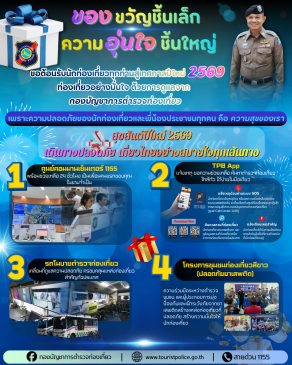ภายใต้แนวคิด “ของขวัญชิ้นเล็ก ความอุ่นใจชิ้นใหญ่” พล.ต.ท.ศักย์ศิรา เผือกอ่ำ ผู้บัญชาการตำรวจท่องเที่ยว สั่งการให้หน่วยในสังกัดดูแลความปลอดภัยในแหล่งท่องเที่ยวและสถานที่จัดงานปีใหม่ทั่วประเทศอย่างเข้มข้น พร้อมอำนวยความสะดวกและช่วยเหลือนักท่องเที่ยว ผ่าน “ของขวัญปีใหม่” จากตำรวจท่องเที่ยว ได้แก่