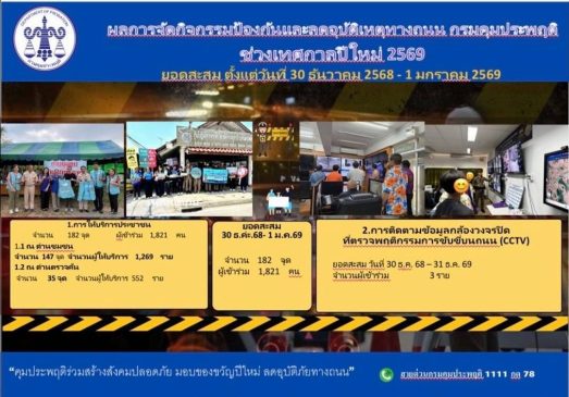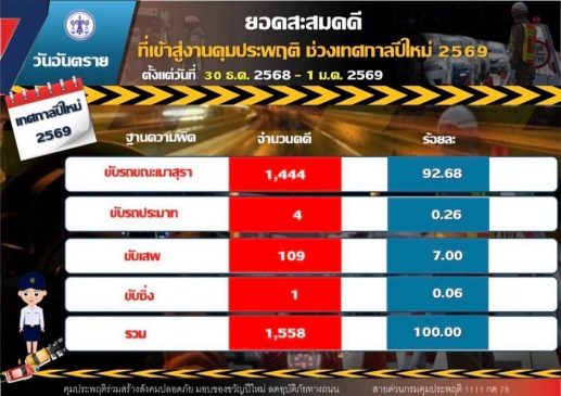 ขณะที่ยอดคดีสะสมตลอด 3 วัน (30 ธันวาคม 2568 – 1 มกราคม 2569) รวมทั้งสิ้น 1,558 คดี แบ่งเป็น