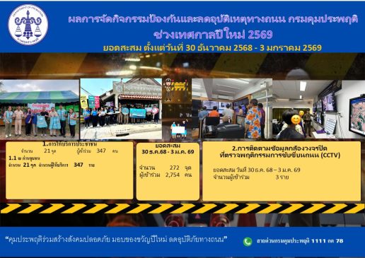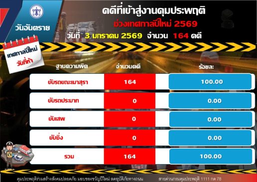 ขณะที่ยอดคดีสะสมตลอด 5 วัน (30 ธันวาคม 2568 – 3 มกราคม 2569) รวมทั้งสิ้น 3,123 คดี แบ่งเป็น