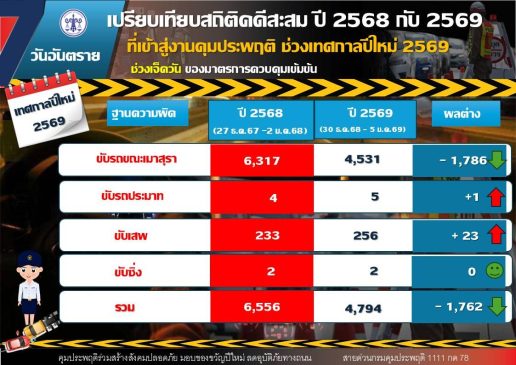 เมื่อเปรียบเทียบกับสถิติคดีสะสม 7 วันช่วงเดียวกันของปีที่แล้ว ซึ่งมีคดีขับรถขณะเมาสุรา