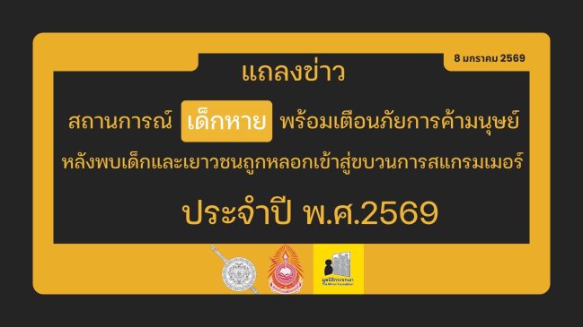 ตร. ร่วมกับมูลนิธิกระจกเงา แถลงสถานการณ์ “เด็กหาย” เนื่องในวันเด็กแห่งชาติ พร้อมเตือนภัยการค้ามนุษย์ยุคใหม่ หลังพบเด็กและเยาวชนถูกหลอกเข้าสู่ขบวนการสแกมเมอร์