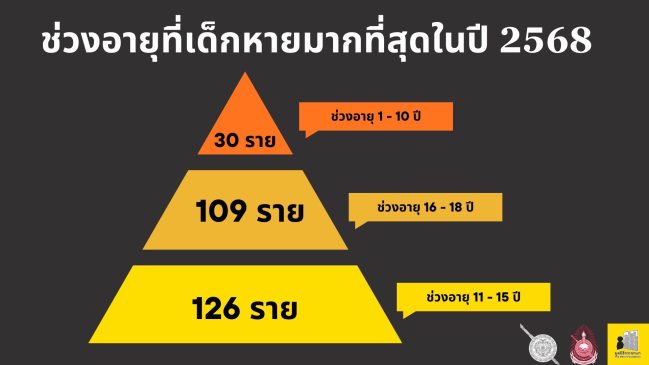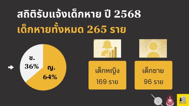 ตลอดปี 2568 มูลนิธิกระจกเงาได้รับแจ้งเด็กหายรวม 265 ราย เป็นเด็กชาย 96 ราย และเด็กหญิง 169 ราย โดยมีเด็กหาย 47 รายที่ยังไม่พบตัว