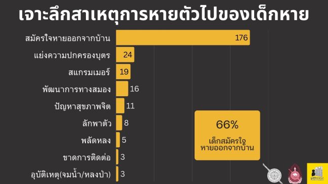 สาเหตุหลักของเด็กหาย ได้แก่ การสมัครใจหนีออกจากบ้าน 176 ราย รองลงมาคือ การแย่งการปกครองบุตร 24 ราย และการถูกหลอกไปเป็นสแกมเมอร์ 19 ราย นอกจากนี้ยังพบกรณีเกี่ยวข้องกับพัฒนาการทางสมอง ปัญหาสุขภาพจิต การพลัดหลง การขาดการติดต่อ และอุบัติเหตุ โดยในปีที่ผ่านมามีเด็กเล็กถูกลักพาตัวถึง 8 ราย