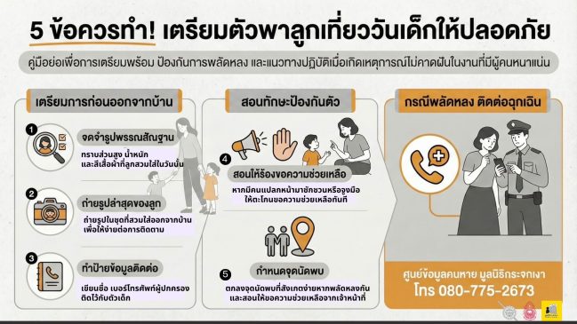สำหรับการพาบุตรหลานเที่ยวงานวันเด็กในปีนี้สำนักงานตำรวจแห่งชาติและมูลนิธิกระจกเงา ขอความร่วมมือผู้ปกครองป้องกันเด็กพลัดหลง โดยควรจดจำรูปพรรณบุตรหลาน ถ่ายภาพล่าสุดพร้อมชุดที่สวมใส่ก่อนออกจากบ้าน ติดป้ายชื่อและเบอร์ติดต่อให้เด็กพกติดตัว สอนจุดนัดพบและวิธีขอความช่วยเหลือ รวมถึงย้ำให้เด็กตะโกนขอความช่วยเหลือทันที หากบุตรหลานหายตัวไป ค้นหาในพื้นที่แล้วยังไม่พบตัว สามารถโทรแจ้ง 191 หรือแจ้งความเด็กหายได้ทันที โดยไม่ต้องรอครบ 24 ชั่วโมง