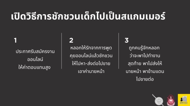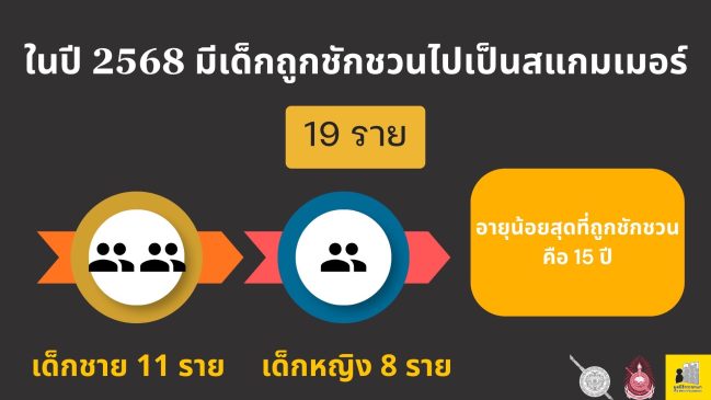 นายเอกลักษณ์ หลุ่มชมแข หัวหน้าศูนย์ข้อมูลคนหาย มูลนิธิกระจกเงา ระบุว่า ปีที่ผ่านมาพบสถานการณ์ที่น่ากังวล คือ การค้ามนุษย์ในรูปแบบใหม่ เด็กอายุ 15–18 ปี อย่างน้อย 19 ราย ถูกหลอกไปทำงานสแกมเมอร์ในประเทศเพื่อนบ้าน รูปแบบการหลอกลวงมักเริ่มจากการชักชวนผ่านออนไลน์ ประกาศงานค่าตอบแทนสูง หรือหลอกให้เกิดความสัมพันธ์ ก่อนพาเดินทางและส่งต่อให้ขบวนการเพื่อแสวงหาประโยชน์