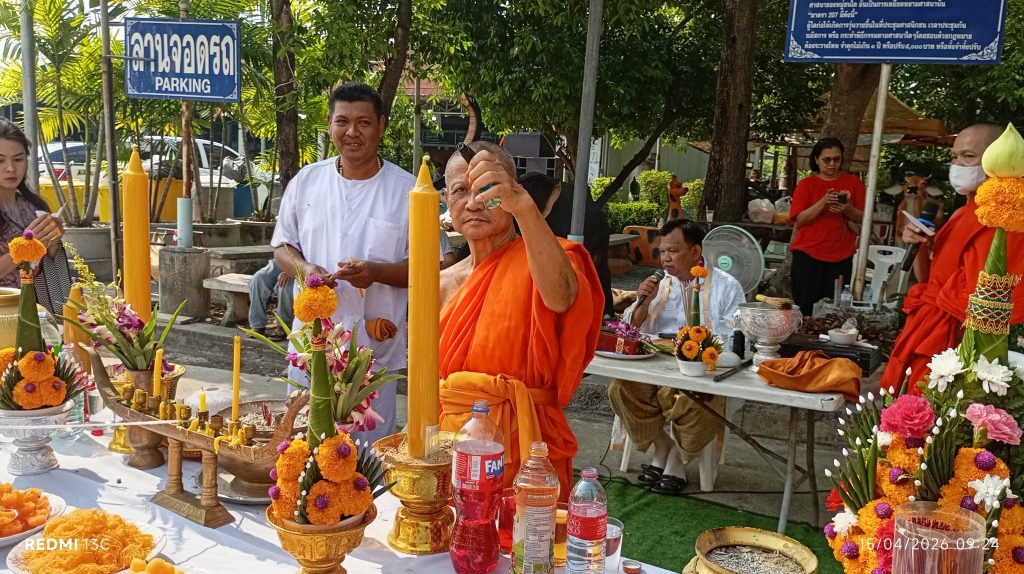 พระภิกษุสงฆ์ จำนวน 9 รูป เดินทางมาถึงลาน ชั้น 4 พลับพลาไชย เป็นที่เรียบร้อยแล้ว นายกิตติ์ธนวัจน์ (เอียเมา) ผู้สร้างศาลพ่อปู่ยึ่ก่อฮง ได้เชิญ พล.ต. ชัยกฤต โพธิ์อ๊ะ ผบก.น6 เป็นประธานจุดเทียนธูปหน้าพระรัตนไดยและเทียนที่บาตรน้ำมนต์ จากนั้นพระภิกษุท่านได้เจริญพรพระคาถาชัยมงคล และสวดแผ่บุญกุศลให้แก่พ่อปู่ยี้ก่อฮงที่ล่วงลับไปแล้วพร้อมสวดให้พรแก่ผู้ที่มาร่วมงานบุญ