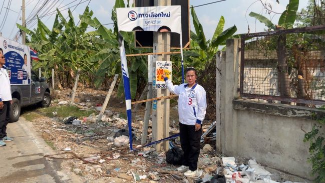 เต้ มงคลกิตติ์ และราเชน ตระกูลเวียง หัวหน้าพรรคฯ พาผู้สมัครพรรคทางเลือกใหม่แจ้งความถูกทำลายป้ายหาเสียง พร้อมสู้อย่างโปร่งใส ไม่ซื้อเสียง