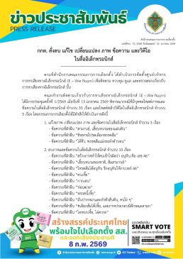 วันที่ 22 ม.ค.69 สำนักงานคณะกรรมการการเลือกตั้ง (กกต.) โดยศูนย์บริหารการหาเสียงทางอิเล็กทรอนิกส์ (E-War Room) เดินหน้าคุมเข้มการหาเสียงออนไลน์ ล่าสุดสั่งดำเนินการกับโพสต์ภาพ ข้อความ และวิดีโอที่ฝ่าฝืนกฎหมายรวม 40 รายการ เพื่อความสงบเรียบร้อยก่อนการเลือกตั้ง สส. และการออกเสียงประชามติ ในวันที่ 8 กุมภาพันธ์ 2569
