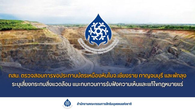 2. กสม. ตรวจสอบการขอประทานบัตรเหมืองหิน 3 แห่ง ในจังหวัดเชียงราย กาญจนบุรี และพัทลุง ชี้เสี่ยงเกิดผลกระทบต่อสิ่งแวดล้อม แนะทบทวนการรับฟังความเห็นและแก้ไขกฎหมายแร่