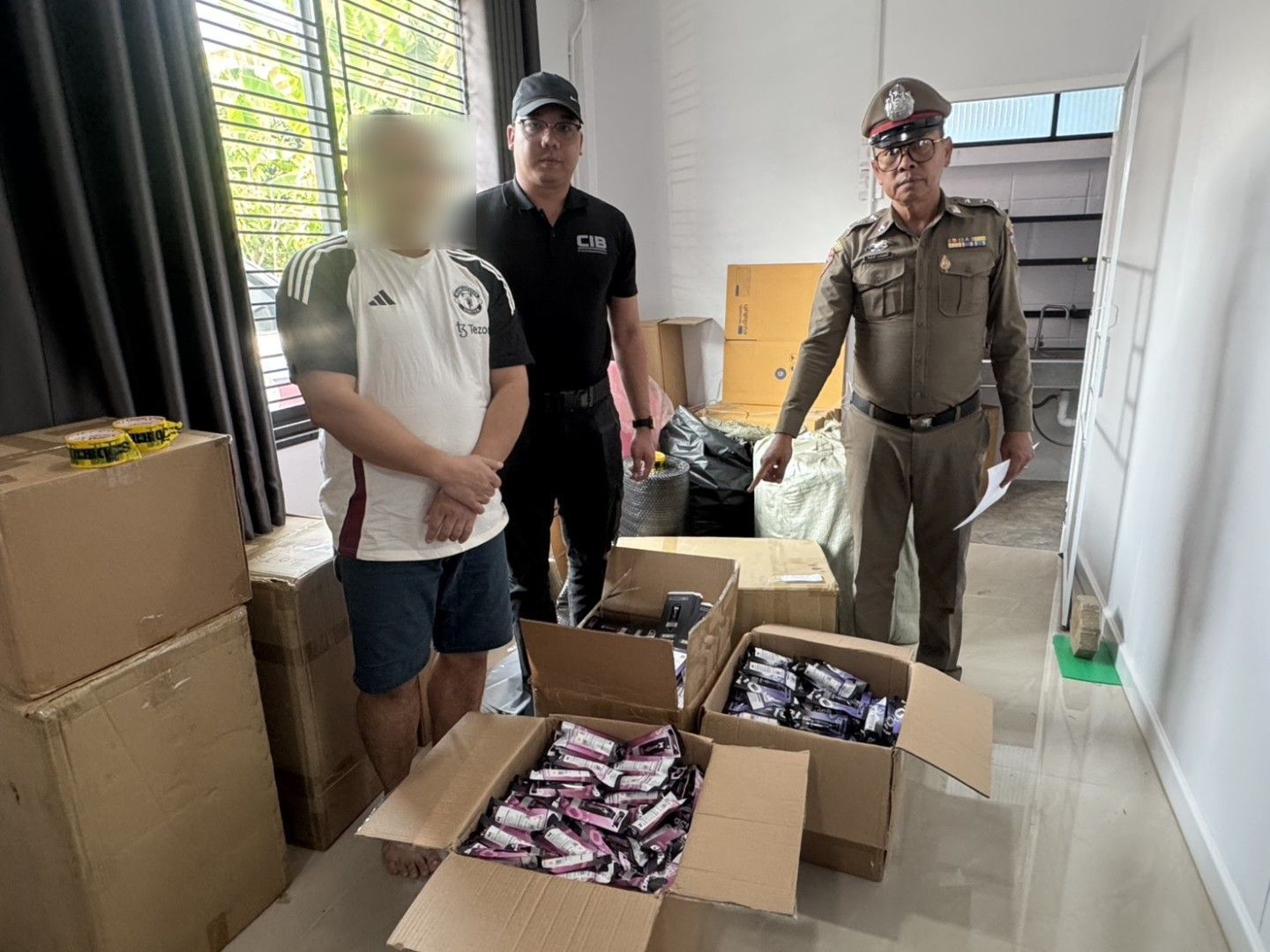 กองบัญชาการตำรวจสอบสวนกลาง (CIB) โดย กองบังคับการปราบปรามการกระทำความผิดเกี่ยวกับการคุ้มครองผู้บริโภค (บก.ปคบ.) ภายใต้การอำนวยการของ พล.ต.ต.คงกฤช เลิศสิทธิกุล ผบก.บก.ปคบ. และชุดปฏิบัติการนำโดย พ.ต.ต.กฤตภาส พึ่งนุสนธิ์ สว.กก.1 บก.ปคบ. ร่วมกันแถลงผลการจับกุมขบวนการลักลอบจำหน่ายบุหรี่ไฟฟ้ารายใหญ่ในพื้นที่ จ.กาญจนบุรี