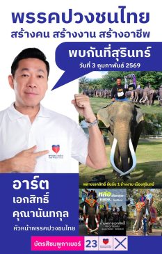 แหล่งข่าวจากจังหวัดสุรินทร์รายงานว่า ในวันอังคารที่ 3 กุมภาพันธ์ 2569 เวลา 17.00 น. พรรคปวงชนไทย นำโดย นายเอกสิทธิ์ คุณานันทกุล หัวหน้าพรรคปวงชนไทย พร้อมคณะ เตรียมจัดเวทีปราศรัยใหญ่ ณ บริเวณศูนย์คนพิการจังหวัดสุรินทร์ หมู่ที่ 3 ตำบลนาดี อำเภอเมือง จังหวัดสุรินทร์ เพื่อพบปะพี่น้องประชาชนและนำเสนอแนวนโยบายในการพัฒนาจังหวัดสุรินทร์ในทุกมิติ